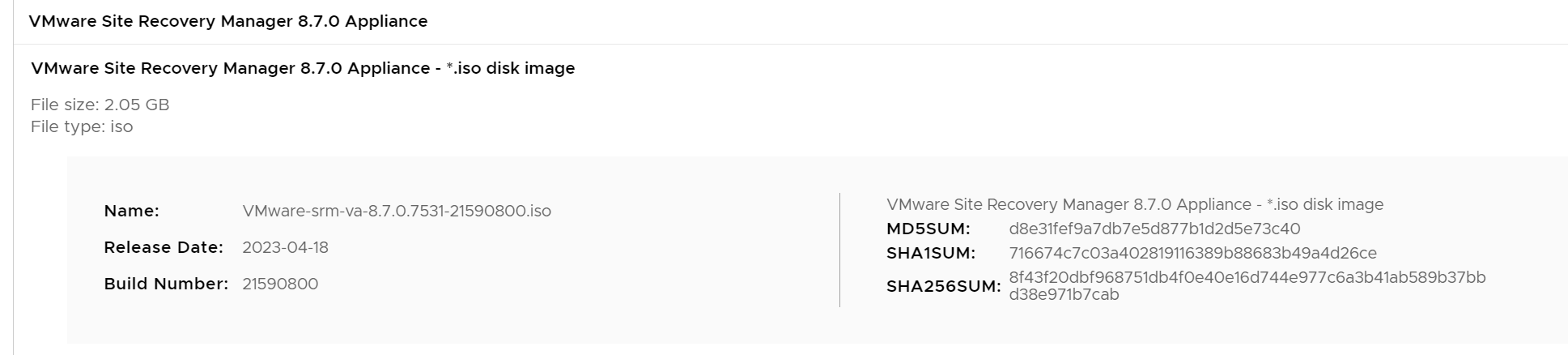 | VMware-srm-va-8.7.0.7531-21590800.iso | 1.8 GiB | 2023-Apr-18 16:30 |